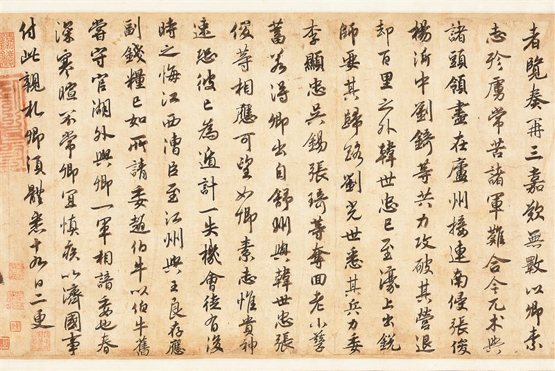 〈宋高宗賜岳飛批剳〉為蘭千山館寄存作品,書於岳飛死前1年。宋高宗在此信中,慰勉岳飛帶兵辛勞,而細觀其中「領」、「若」等字,可見書學〈蘭亭序〉痕跡。圖/故宮提供
