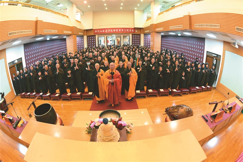 佛光山金蓮淨苑17日舉行「甘露灌頂三皈五戒」典禮,恭請心保和尚(前排中)主法,350位信眾成為正信三寶弟子。圖/人間社記者蔡忠宏