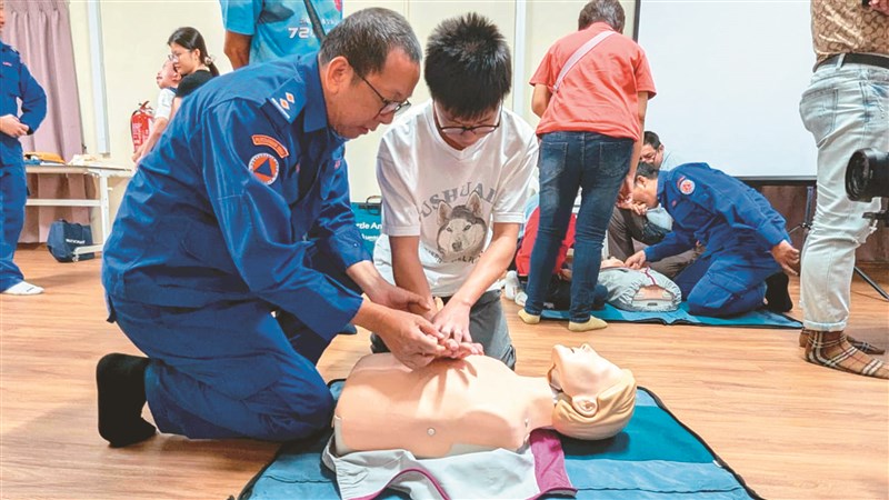 大馬佛光民防救護隊隊員李福財(左)指導學生,演練心肺復甦術。圖/佛光民防救護隊提供
