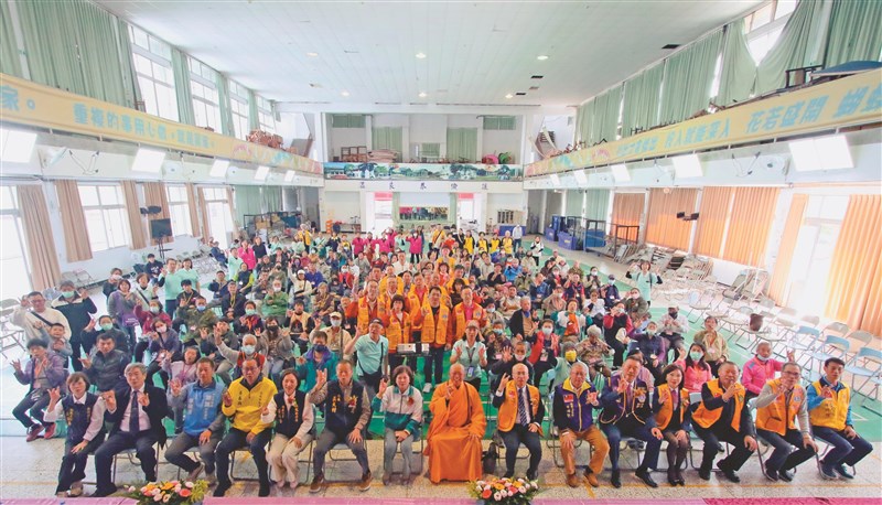 佛光山慈悲基金會、清德寺、國際獅子會300C1區東南獅子會,17日在南投縣集集國中舉辦「2026年第27屆聯合歲末寒冬送暖活動」,清德寺住持慧龍法師(前排中)偕陳碧月(前排左7)等佛光人及李俊鋒(前排右7)等獅友,與貴賓、福田戶合影。圖/人間社記者李崑銘