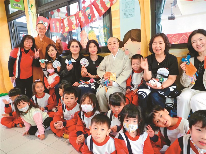 南韓東國大學幼兒教育學系系主任金銀慶教授(後排右2)與附屬幼兒園園長能見法師(後排右4),與慈航幼兒園師生合影。圖/人間社記者陳芷芸