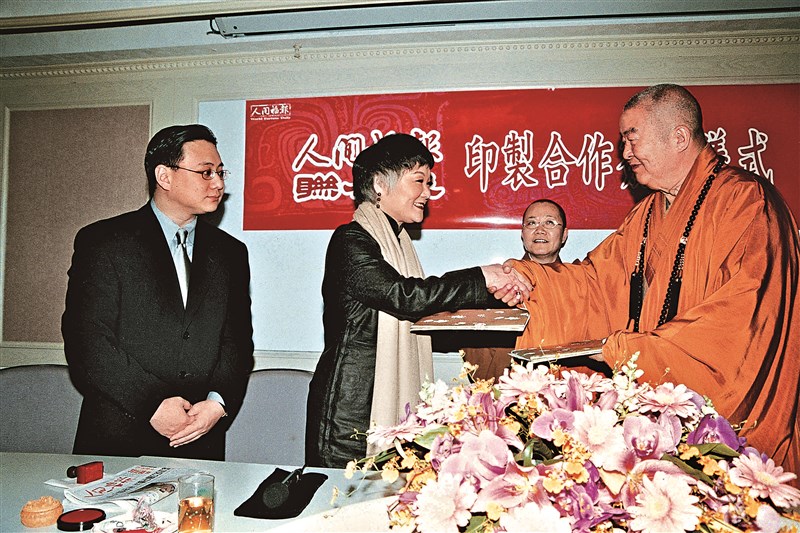 2000年3月27日,星雲大師與王效蘭女士分別代表《人間福報》、《聯合報》,於佛光山台北道場簽訂印報合作儀式,右2為時任《人間福報》社長依空法師。《人間福報》於同年4月1日正式創刊。圖/佛光山提供