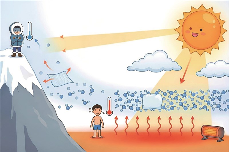 但大氣密度及壓力會隨著海拔升高而遞減,高山上的空氣壓力會降低,空氣較稀薄。也就是那裡的空氣分子少又分散,碰撞次數減少,就像稀稀疏疏的一群人,又站得零零落落的,很難維持足夠熱量。這時,就算從地面接收到一點熱量,也會很快散失到周遭的空間,所以不容易吸熱,也比較難以保溫。