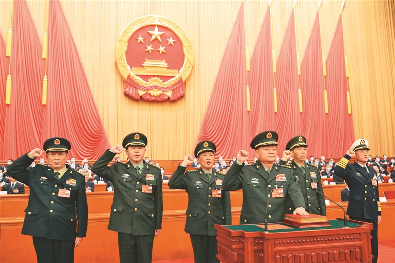 圖為2023年3月11日,中共14屆全國人大一次會議在北京人民大會堂舉行第4次全體會議,中央軍委副主席張又俠(前排中)率軍委其他5名成員進行憲法宣誓。不到3年時間,如今只剩張升民(後排左1)1人還在任。圖/中新社