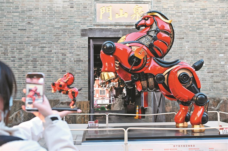 為迎接馬年春節,福建泉州打造的馬年生肖IP「六合同風馬」藝術裝置陸續登場,設計團隊從6位與泉州息息相關的歷史人物故事中提取靈感,創作出「天.召召」、「地.玩玩」、「東.守守」、「南.樂樂」、「西.鯉鯉」與「北.猛猛」六匹氣質、意涵各異的駿馬,讓人文精神以當代藝術的形式生動再現。圖為日前遊客在泉山門前手拿同款文創品與「北.猛猛」合影。 圖/中新社
