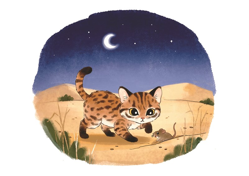 牠的腳底是全黑的,不是中毒也不是踩到煤炭,而是天生的。這雙「黑色隱形鞋」能讓牠悄無聲息的潛行在沙地上,還能防止被炙熱的地面燙傷。夜色中,黑足貓悄悄出門,輕巧的在沙地上移動,一晚能跑八公里,搜尋晚餐。沙鼠、老鼠、鳥、昆蟲,甚至體型比牠還大的草兔都能成為牠的獵物。