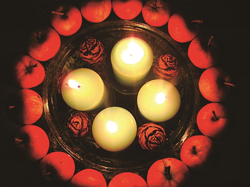 每一年我都會自做創意Adventskranz,而且盡量用現成的材質,去年做了兼具傳統習俗與創意時尚感的「蘋果(平安) 花圈」,圓形舊燈罩做基底,燈罩內擺滿青柏枝和松果、四根蠟燭,點上蠟燭會有淡淡的松柏香,燈罩邊緣就擺上鄰居花園撿的小蘋果(過完節還可做果醬),松果青柏則是剪自郊野,連蠟燭也是趁對折買的;寶貝女兒看到視訊直呼:那小蘋果圈也太可愛了,媽咪妳幫自己點了「光明燈」。
