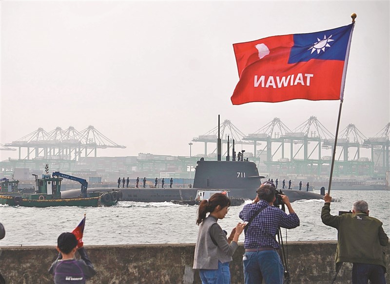 潛艦國造原型艦「海鯤號」昨第六次出海測試,吸引軍事迷前往高雄港口應援,揮舞著印有Taiwan字樣國旗,高喊加油。圖/中央社