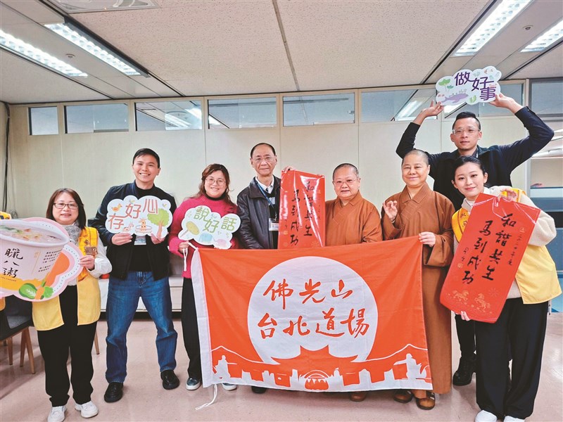 佛光山台北道場於20日至23日,前往台北市公部門各單位致贈臘八粥。為慶祝法寶節,在台北市各據點共送出近10萬碗熱粥廣結善緣,為寒冬中的城市注入溫暖人心的力量。圖為台北道場住持滿謙法師(左5)贈臘八粥至台北市政府民政局,由局長陳永德(左4)代表接受。圖/佛光山台北道場提供