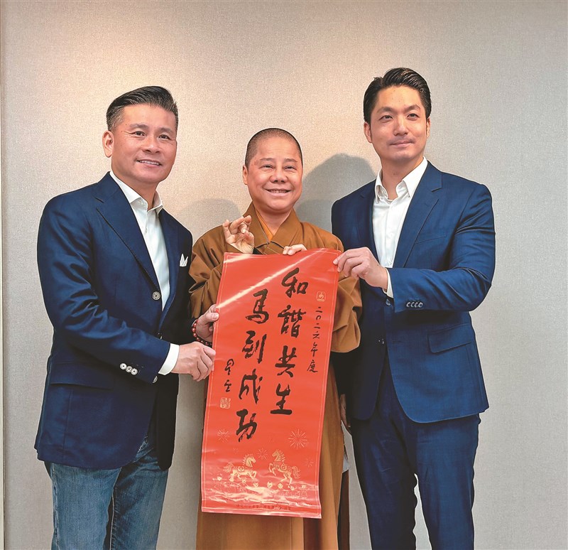 圖為台北道場監院妙眾法師(中)送臘八粥至台北市政府、台北市議會,由市長蔣萬安(右)及市議長戴錫欽代表接受。圖/佛光山台北道場提供