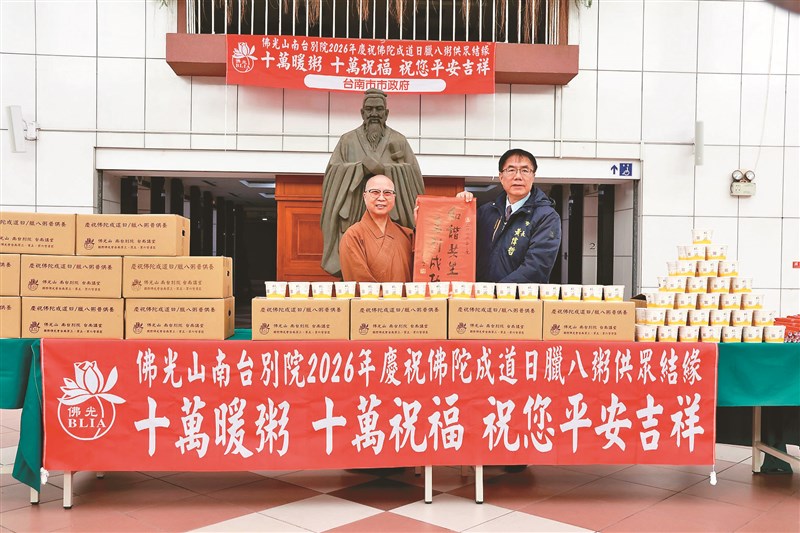 佛光山南台別院為慶祝佛陀成道日,在台南市設27個據點發送10萬碗臘八粥,讓平安傳遍社會角落。為感謝台南市政府照顧市民的辛勞,台南區總住持滿舟法師更在26日致贈臘八粥,送往台南市政府、市議會及警消、調查、基層公所等單位,讓大眾在臘月寒冬感受佛陀慈悲祝福的力量。圖為台南市長黃偉哲代表市民接受法寶節的祝福,願與大眾齊心傳遞人間佛教的真善美。文/人間社記者張媚惠