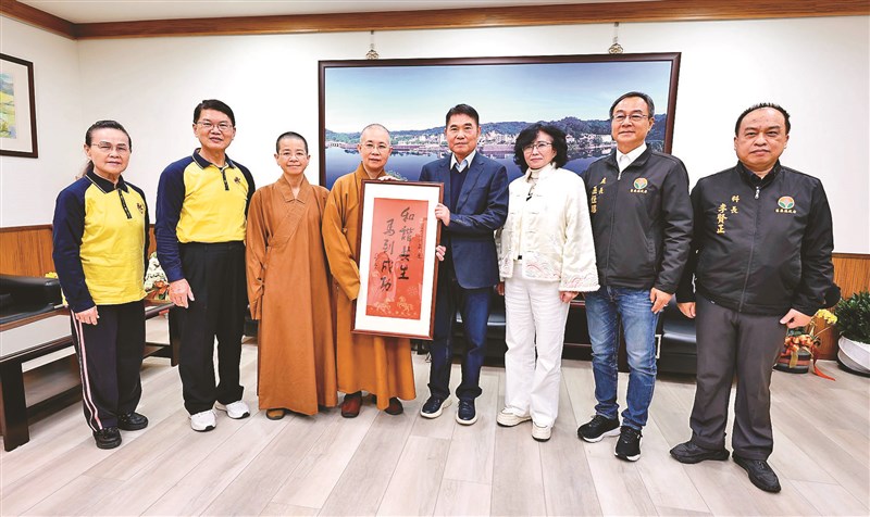 佛光山大明寺、大明社區大學、國際佛光會中華總會苗栗區各分會,由住持妙蓮法師帶領,20日起分批烹煮2萬杯以上的臘八粥供眾,將佛陀成道的法喜傳遞到社會每一個角落。妙蓮法師(左4)26日偕中華總會監事張清川(左2)等幹部,送臘八粥到苗栗縣政府,縣長鍾東錦(右4)、副縣長邱俐俐(右3)、民政處長巫恒昭(右2)等官員,歡喜會見並合影。圖/人間社記者邱乾海