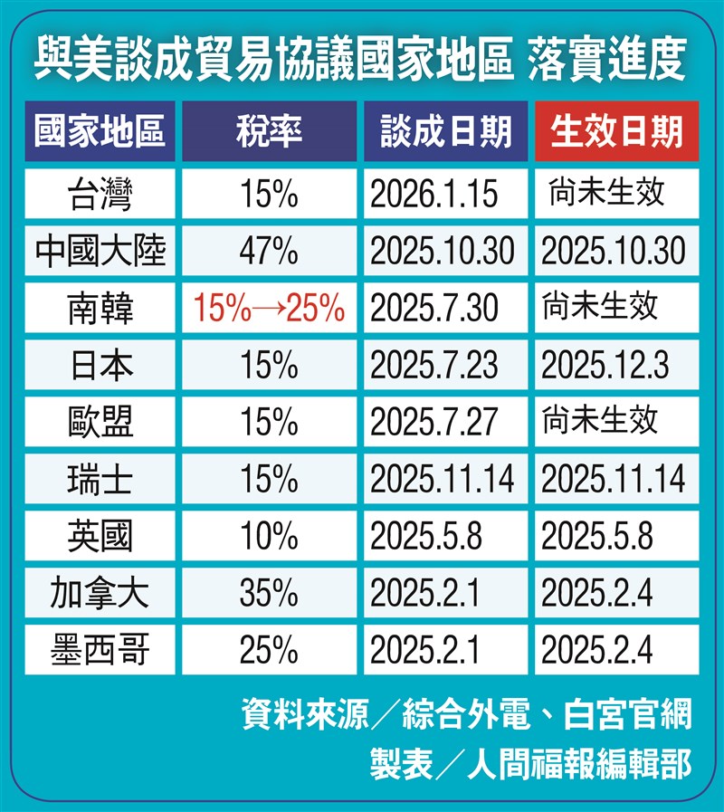 美威脅南韓 加徵關稅至25% 本報綜合外電報導 |2026.01.28 語音朗讀 22觀看次 字級 大 中 小 美國總統川普26日宣布,因南韓國會尚未通過韓美貿易協議,美國將南韓輸美汽車、木材、藥品等關稅由15%調高至25%。圖為南韓平澤港口,停滿待出口的汽車。圖/美聯社美國總統川普(左)去年10月底訪南韓,會晤南韓總統李在明。圖/美聯社與美談成貿易協議國家地區 落實進度 製表/人間福報編輯部 【本報綜合外電報導】美國總統川普26日在社群平台發文表示,由於南韓國會遲未通過韓美貿易協議並正式立法,美國將把南韓輸美汽車、木材、藥品與所有對等關稅項目稅率,由15%調高至25%。南韓執政黨說,將推動相關法案2月底前在國會過關。川普發文砲轟南韓國會,表示「我與李在明總統去年7月30日達成貿易協議,並於同年10月29日訪韓期間再次確認條款,為什麼南韓國會還沒有批准?」川普說,「南韓國會尚未制定並通過這項具歷史意義的協議,這是他們的權限。我在此宣布,增加南韓輸美汽車、木材、藥品的關稅稅率,以及所有其他對等關稅項目,稅率從15%提高至25%」。韓美去年7月談妥貿易協議,將對等關稅降至15%,並由韓方加碼對美投資3500億美元(約新台幣11兆元)。韓承諾對美投資 上半年難撥款《紐約時報》報導,白宮截至當地26日晚間尚未頒發行政命令實施對韓新稅率。路透報導,目前尚不清楚這波關稅調升何時生效。川普過去曾對其他國家威脅提高關稅,但有時延後執行或最後並未實施。南韓總統府青瓦台表示,「美國政府尚未發出正式通知,也未對細節作出說明」,政府將召開緊急會議,並派產業部長金正官赴華府與美國商務部長盧特尼克協商,同時將密切協調國會通過相關立法。南韓財政部27日也回應說,「目前正在掌握美方的意向」,並稱「將向美方說明南韓國會法案討論的進展等,並與美國政府保持溝通」。財政部長具潤哲表示,韓方並非刻意拖延投資,而是仍在篩選計畫並完成必要程序,考量選址、設計與審批流程所需時間,今年上半年恐難以撥款。市場方面,川普關稅威脅一度衝擊南韓汽車股,現代與起亞早盤急挫後跌幅分別收斂至0.51%和1.61%,而整體股市反應相對平穩,南韓綜合股價指數(KOSPI)上漲2.26%,報創新高的5061.56點。川普宣布南韓關稅由原本的15%調高至25%,引發國際關注。總統賴清德昨在節目專訪上呼籲在野黨能給予支持,直言政黨競爭難免,但不要「焦土政策」。賴總統談到,台灣在談判過程中投入大量心力,做足準備並與產業界共同提出方案,最終獲得此一成果。他呼籲國會支持,避免變數,「不然美國是很可能將本來的15%關稅,提高至25%,甚至更高」。防美變卦 賴總統籲國會支持 立法院長韓國瑜今天將召集朝野黨團協商,討論「行政院長卓榮泰針對台美關稅談判進程、產業衝擊影響評估等面向,進行專案報告」公決案,預料在野黨可能會要求卓榮泰盡快赴立院說明,讓國人了解談判進度。台灣美國商會執行長魏凱表示,若南韓的關稅真的提高到25%,台灣企業會更有競爭力;台灣美國商會理事長陳幼臻說,不樂見看到台灣也發生跟南韓一樣的狀況。淡大戰略所教授兼所長李大中說,台、韓狀況不盡相同,南韓執政黨立場認為可透過通過《赴美投資特別法》,間接落實韓美談判結果,但在野黨主張必須送到國會審查,因此陷入僵局;至於台灣,《台美對等貿易協定》還沒最後簽署,政府應對立院提供詳盡說明。 前一篇文章 台電終止3年虧損 2025年估賺逾600億元 下一篇文章 習近平會芬蘭總理 稱大國要講平等法治 熱門新聞 01【研朱札記】《臺灣文學》的 誕生地──山水亭2026.01.2702聯合國示警 全球水資源破產2026.01.2203吃素好體力 霍諾德登頂101 2026.01.2604佛光山職員歲末聯誼 祈願和諧共生2026.01.2405【分享時刻】我如何從潑墨走回工筆2026.01.2206澤倫斯基瑞士演說 控俄飛彈含台灣零件 2026.01.2407【海闊天空】廢墟中重建 塵土之上的伊拉克2026.01.2408【文化遺產】世界最大石雕佛像──樂山大佛2026.01.2309金光明寺送暖 音樂饗宴12年不輟2026.01.2310人間佛教讀書會培訓 南非學員在地深耕2026.01.22 訂閱電子報 台北市 天氣預報 台灣一週天氣預報 相關報導 習近平會芬蘭總理 稱大國要講平等法治漂浮農田 永續糧食解方吃素好體力 霍諾德登頂101 美新國防戰略未提台灣 抗中非優先任務印度減廢 塑膠垃圾抵學費 澤倫斯基瑞士演說 控俄飛彈含台灣零件 作者其他文章英捕鼠大臣 險絆倒波蘭總統攝影師足球好手 挑球28小時不落地創紀錄一站式科研船 把深海生態變親民川普揚言祭100%關稅 卡尼揭意圖 歷時20年 歐盟、印度達成自貿協定高市背水一戰:眾院沒過半就下台 習川熱線 傳聚焦台灣軍援軍售、TikTok議題