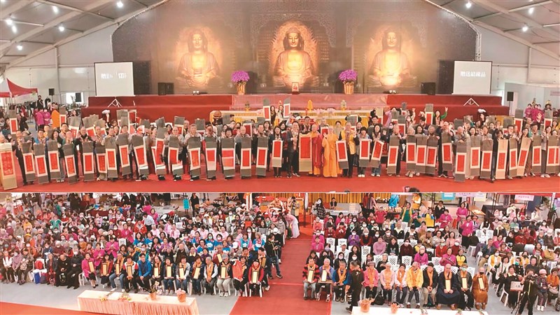 佛光山桃園講堂24、25日,在桃園弘法新基地盛大舉辦「慶祝法寶節──寒冬送暖臘八粥系列活動」,除了莊嚴的祈福儀式,更是結合「傳統戲曲藝術」、「科技互動體驗」、「三好市集」、「素食小夜市」的文化嘉年華,吸引近2萬民眾參與。圖為第一天開幕典禮大合照。