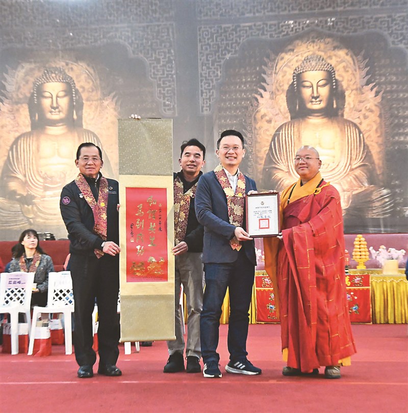 佛光山住持心保和尚(右1)致贈星雲大師墨寶卷軸「和諧共生 馬到成功」,桃園市副市長蘇俊賓(右2)致贈感謝狀,感謝佛光山長期深耕地方公益。