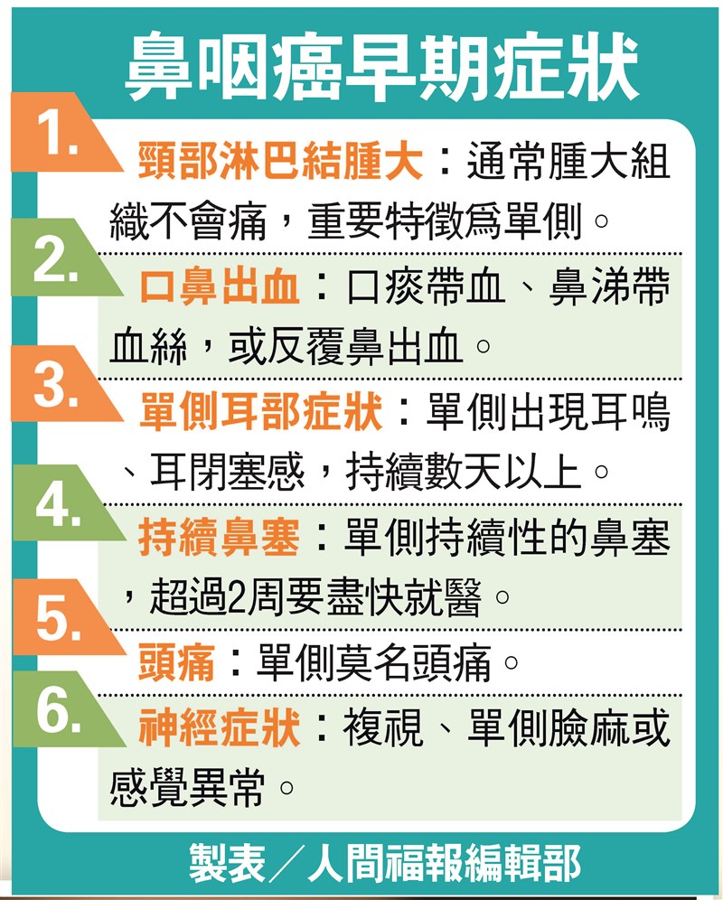 王成平指出,任何年齡的人都可能罹患鼻咽癌,門診每年都有2、3位十幾歲患者的個案,30多歲的個案也不在少數。早期症狀不明顯,常被誤認為感冒或過敏,「鼻涕帶血、持續2周鼻塞」是重要警訊,另外,耳朵悶脹、痰中帶有血絲、不明原因的頸部腫瘤,務必提高警覺就醫檢查。