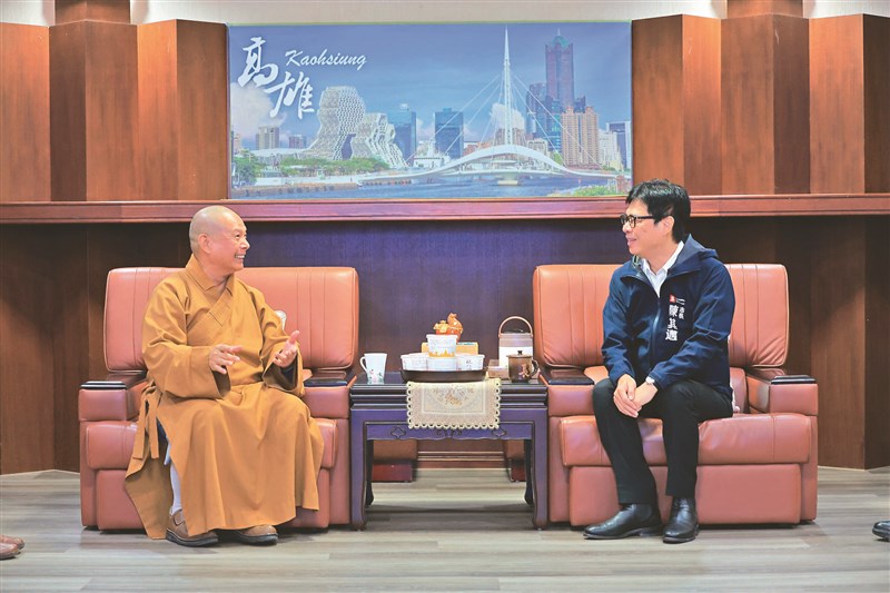 1月26日法寶節,佛光山常務副住持慧傳法師(左)與南屏別院住持妙樂法師,代表佛光山前往高雄市政府拜會高雄市長陳其邁(右),表達新春祝福與關懷。圖/人間社記者莊佳穎