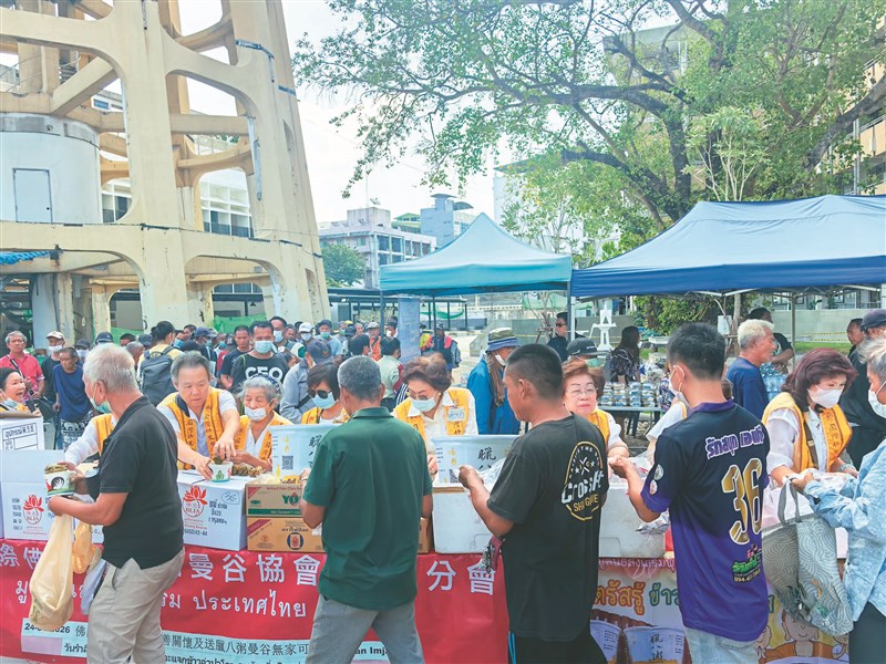 佛光山曼谷文教中心26日啟動為期3天的暖心施粥活動,紀念佛陀成道日。連同國際佛光會泰國曼谷協會廣送逾3000碗臘八粥,分享曼谷的無家者、垃圾回收社區、軍人及華僑醫院、警察局、稅捐處、學校等,傳遞佛陀的慈悲與祝福。圖為泰國佛光人到曼谷街友聚集地發送臘八粥。圖/國際佛光會泰國協會提供