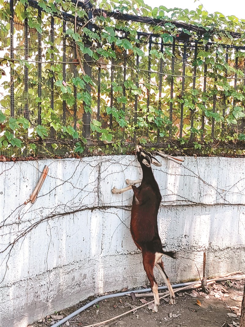 一隻黑色山羊伸長了脖子,專注地啃食牆外縫隙間,攀爬而入的枝葉,彷彿天地間再無他物可吸引牠的目光,撼動牠的心神。那拚命展延的四肢與伸長的脖頸,在空中凝聚成無形卻令人印象深刻的兩個字:好餓。
