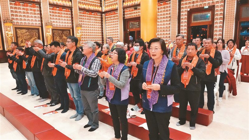 新北市政府社會局長李美珍(前排右1)偕區、里長等嘉賓,虔誠恭誦《般若心經》、恭讀星雲大師〈獻燈祈願文〉,並獻上盞盞明燈,祈願大眾身心健康、國泰民安。圖/人間社記者吳新傳
