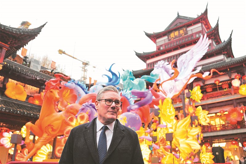 英國首相施凱爾30日飛抵上海後,前往豫園觀賞馬年花燈。圖/美聯社