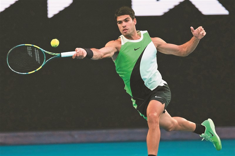 澳網男單決賽,阿爾卡拉斯開賽熱機稍慢,首盤僅耗時31分鐘便以2:6讓出,不過進入第二盤後逐漸找回節奏,逆轉對手。圖/美聯社
