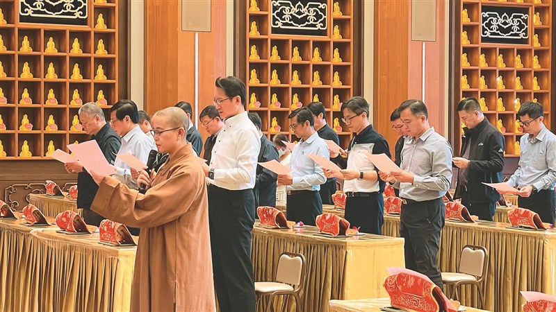 佛光山潮州講堂監寺妙辰法師(前排)領眾恭讀星雲大師〈為警察祈願文〉,祈願新的一年警務順利圓滿。圖/人間社記者陳縈華
