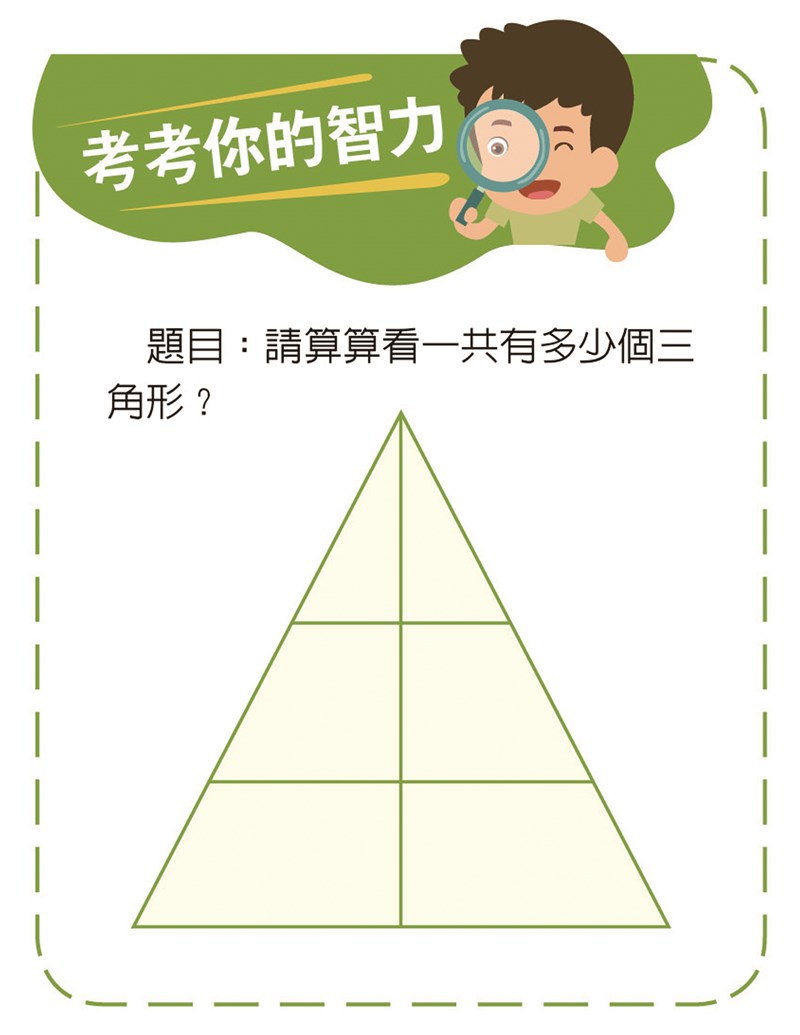 【考考你的智力】 |2026.02.02 語音朗讀 17觀看次 字級 大 中 小 【考考你的智力】 題目:請算算看一共有多少個三角形? 【考考你的智力】題目:請算算看一共有多少個三角形?考考你的智力解答:9個 前一篇文章 海洋中長腿生物 下一篇文章 熱門新聞 01【研朱札記】《臺灣文學》的 誕生地──山水亭2026.01.2702【閃文集】獨特自主的貓咪2026.01.2703【獻給動物朋友的詩】站成蘭花的螳螂與嘗到幸福滋味的蜂2026.01.2904【傳燈六十‧百年仰望】星雲大師一筆字書法紀念特展概述2026.01.3005大明寺熱粥傳祝福 鍾東錦致謝2026.01.2706馬太鞍溪堰塞湖幾見底 降挖團隊撤離2026.01.2707漂浮農田 永續糧食解方2026.01.2708星雲大師全集【傳記】百年佛緣─生活篇 我的醫療團隊 4-12026.01.2709澳網 辛納拚3連霸 小蠻牛盼全滿貫2026.01.3010海鯤號6度海測 台船:安全無虞下交艦2026.01.27 訂閱電子報 台北市 天氣預報 台灣一週天氣預報 相關報導 海洋中長腿生物細數動物長腿地熱能認識地熱影子魔法從博物館到手機螢幕