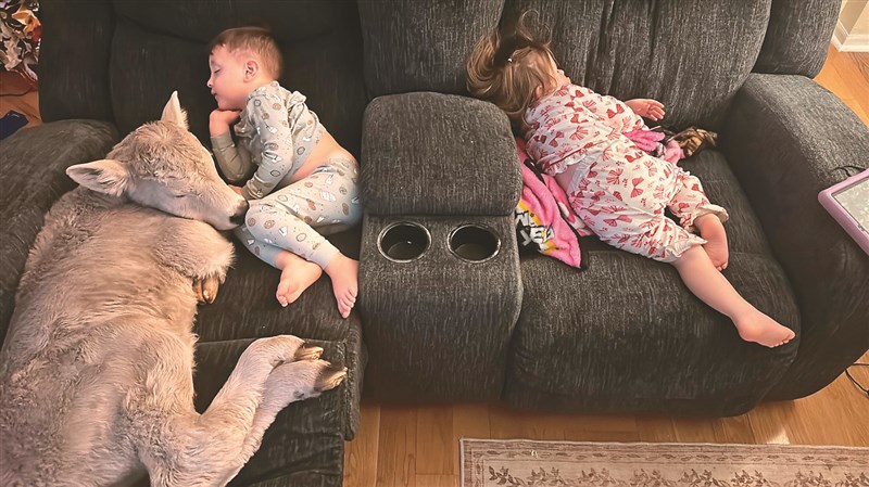 【本報綜合外電報導】美國肯塔基州一名農場主索瑞爾(Macey Sorrell),日前在社群媒體分享了一張溫馨照片,畫面中,一隻剛出生的小牛,正蜷縮在溫暖的沙發上,與她的兩個孩子並肩熟睡,如童話般的畫面隨即治癒無數網友。