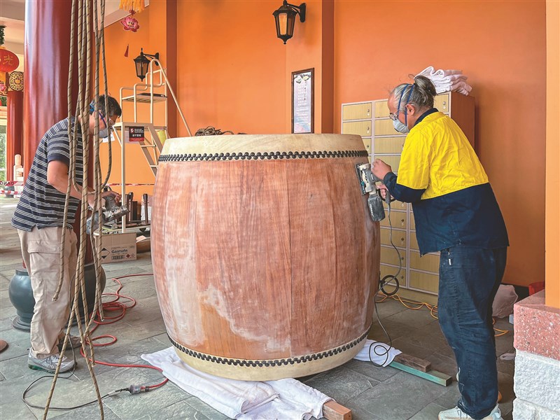 修繕工序包括打磨漆面、填補裂縫、結構加固、反覆上漆與鼓面養護,多道程序層層完成,猶如修行次第——耐心、專注、恭敬,最後還需眾人合力懸掛歸位。周艷峰表示,若無眾人齊心難以圓滿,這不只是工程,更是一場共修護法的殊勝因緣。