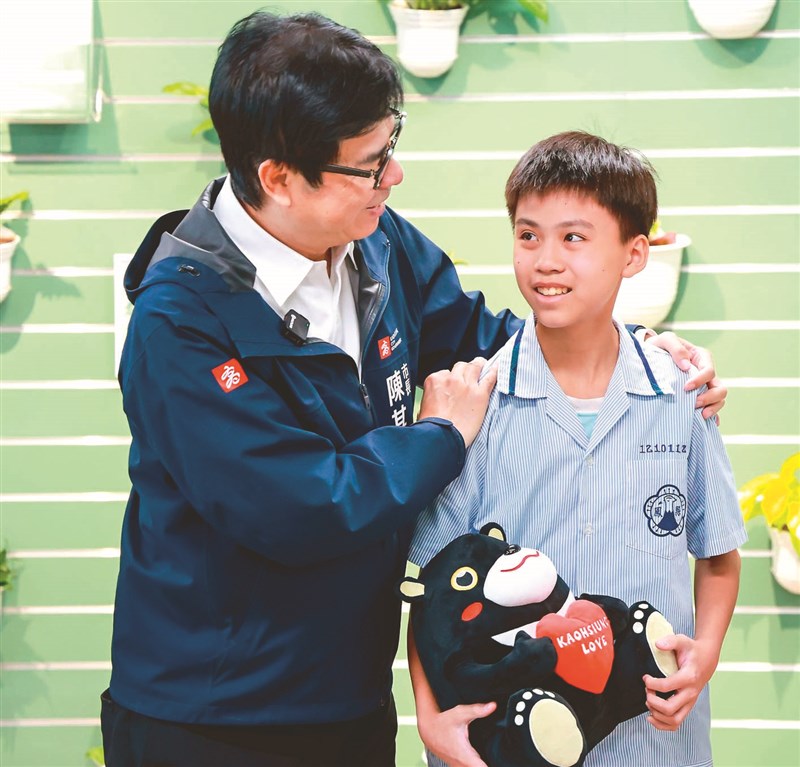 高雄市鳳山國中學生江詠恩(右)日前行經中山東路,看到身障長輩獨自坐輪椅穿越馬路,主動牽著單車,一步步護送陪伴長輩過馬路。這段暖心畫面被拍下並上傳網路,短時間突破百萬次點閱,讓「台灣最美麗的風景」再度被看見,昨獲市長陳其邁(左)公開表揚。