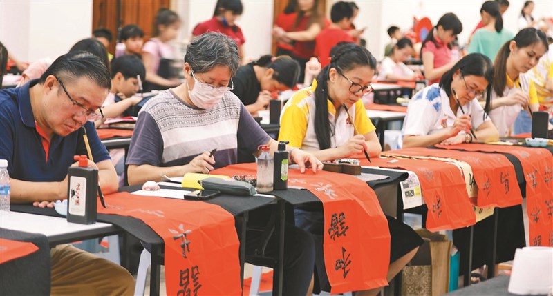 東禪寺揮春比賽現場,吸引338名書法愛好者齊聚揮毫。