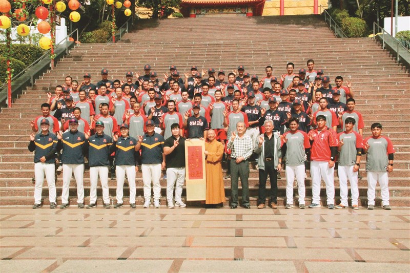 南韓城南高中棒球隊、佛光山普門中學棒球隊友誼賽後,至佛光山參訪,於靈山勝境與普門中學董事長慧傳法師(前排中)合影。圖/人間社記者李生鳳