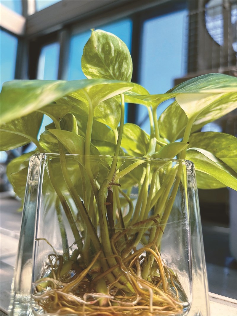 探出廚房連接後陽台的門,左側洗衣機上方即是擺放黃金葛的空間。我喚黃金葛為小綠綠,除了一日數回的照看,更喜歡風吹葉片搖曳的丰姿,冒出的新嫩葉捲,常使六旬婦人手捧小綠綠,蹦跳轉身回到十七歲。