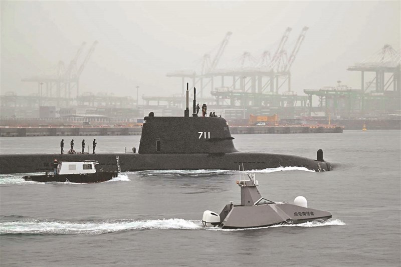 國造海鯤艦昨天進行第4次潛航測試,台船自主研發的「奮進魔鬼魚號」無人船(前右)也一起出海。圖/中央社