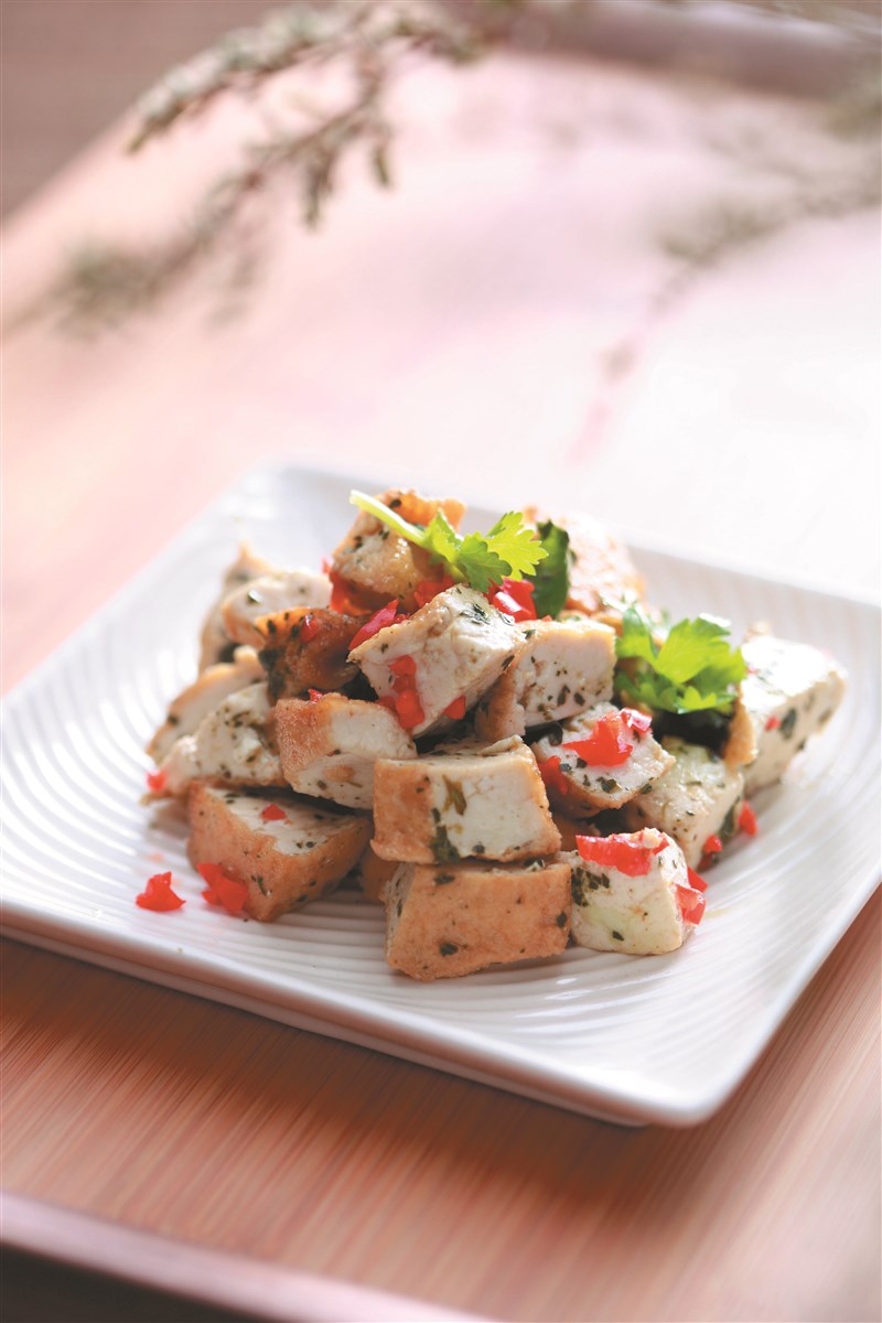 放入油豆腐丁,以中火炒香炒勻,再加鹽和醬油拌炒幾下。