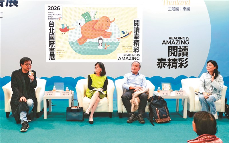 2026台北國際書展進入第5天,福報文化昨天主辦的「《文心雕佛》國際書展座談會」於「藍沙龍」登場!由主編宇文正(右起)主持,邀請作者群楊渡、廖玉蕙、許悔之對談。圖/記者張睿杰