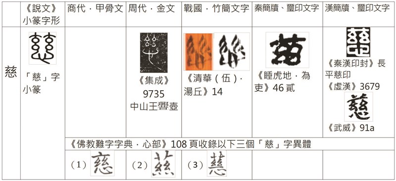 慈悲喜捨 星雲大師一筆字書法字源 文/王瑜楨(佛光大學語文學系助理教授) |2026.02.08 語音朗讀 33觀看次 字級 大 中 小 圖/資料照片常存慈悲心,用美好言語讚美鼓勵他人,能給人歡喜,帶給他人力量,增進人間真善美。圖/資料照片慈 圖/王瑜楨提供佛法的慈悲心,與孔子主張的仁慈之心、孟子主張的惻隱之心觀點接近。圖/資料照片慈、悲、喜、捨就是四無量心,能消除貪、瞋、痴、慢、疑等邪見,也是我們依止安住所在。圖/資料照片捨 圖/王瑜楨提供喜 圖/王瑜楨提供悲 圖/王瑜楨提供 文/王瑜楨(佛光大學語文學系助理教授) 你的心住在哪裡?我們的心,要住在平安的慈悲喜捨中。《華嚴經》說:「常樂柔和忍辱法,安住慈悲喜捨中。」慈、悲、喜、捨就是四無量心,能消除貪、瞋、痴、慢、疑等邪見,也是我們依止安住所在。常存慈悲心,用美好言語讚美鼓勵他人,能給人歡喜,帶給他人力量,增進人間真善美。一、「慈悲喜捨」字形發展脈絡關於「慈」、「悲」、「喜」、「捨」字形源流本形、本音、本義三方面發展,可以從字形發展演變表(以下簡稱「《字形表》」)說起。【字形表說明】先列許慎《說文解字》(以下簡稱「《說文》」)小篆,而後由時代早至晚排列,從商代最早甲骨文字形、周代金文字形、戰國竹簡字形、秦簡牘、璽印字形到漢簡牘、璽印字形。第一、「慈、悲、喜、捨」字本音「慈」字,國語注音讀作ㄘˊ,漢語拼音讀作cí。「悲」字,國語注音讀作ㄅㄟ,漢語拼音讀作bēi。「喜」字,國語注音讀作ㄒㄧˇ,漢語拼音讀作xǐ。「捨」字,國語注音讀作ㄕㄜˇ,漢語拼音讀作shě。第二、「慈、悲、喜、捨」字本形本義「慈」字,字形表中,甲骨未見,周代金文、戰國竹簡文字上部未加「艹」旁。漢代以後字形發展和《佛教難字字典》收錄的「慈」字,有的字形上部或加「艹」旁、或加「」形、或加「亠」形。《說文.卷十.心部》曰:「慈,愛也。从心、兹聲。」本義是上對下的慈愛、仁愛,金文中山王壺文例是:「慈孝」,特指父母對子女疼愛;又指菩薩發起慈悲心愛護世間萬物為慈。「悲」字,字形表中,甲骨、金文有「非」字,尚未見「悲」字。「非」字本義是翅膀,表中列出甲骨、金文字形,象翅膀形向左右兩邊展開羽翼,與「菩薩羽翼」的佛教修行重要二法門:「智慧」與「慈悲」不謀而合,羽翼乘載眾生脫離悲苦。字形表中,戰國竹簡以後出現「悲」字,字形變化規律,均為形聲字,从心、非聲。《說文.卷十.心部》曰:「悲,痛也。从心、非聲。」本義是悲戚、哀痛;又指菩薩因感受眾生悲苦,以祂的羽翼愛護眾生,發願解救眾生。「喜」字,字形表中,甲骨、金文構形象「壴」形,表「鼓」字初文,會意字。中國古代鼓鐘,在政治制度、宗教儀式、慶典儀式、軍事戰爭、文化節慶等場合具有示警、計時作用,尤其在祭祀神靈、祈求豐收時,多以鼓歌舞樂。至今,每逢大型節日祭神敬天祭祖時,亦有擊鼓儀式,表示值得慶祝喜樂的祭典,《說文.卷五.喜部》曰:「喜,樂也。从壴、从口。」「捨」字,字形表中,漢代以前僅見「舍」字,「捨」字是漢代以後出現的字形。「舍」字,甲骨、金文、秦漢字形發展規律,唯戰國時期《安大簡(壹).詩經》的字形寫法保留字形原義,象房屋下有地基之形。「捨」是「舍」的分化字,表示放下、捨棄、釋懷。《說文.卷十二.手部》曰:「捨,釋也。从手、舍聲。」《詩經.國風.鄘風.幹旄》說:「何以予之」,「予」字,竹簡本作「舍」,表示給予義。「慈悲喜捨」的「捨」字表示無分別高低,平等施捨、給予眾生。二、文獻典故西元前五~八世紀春秋時期,周王室式微,周天子地位漸衰,諸侯僭越、君臣父子關係失序、社會文化混亂失常,禮樂失去教化人心的作用,孔子倡導恢復禮樂法制;與西元前五、六世紀,印度北部迦毘羅衛國(今尼泊爾境內)出生的佛陀,觀察執政權力壓迫百姓、社會貧富差距懸殊,於菩提樹下證悟,決心捨棄貴族身分出家,度化眾生的歷史背景相似。因此,佛法的慈悲心,與孔子主張的仁慈之心、孟子主張的惻隱之心觀點接近。孔子回應學生子貢如何實行「仁」,《論語.雍也》說:「夫仁者,己欲立而立人,己欲達而達人。」這句話是我們耳熟能詳的名言佳句,仁人的意思是指,自己能做到的事情,要先幫助別人,「奉獻的愛」,「給人因緣」;自己不想做的事情,不會施加給別人。簡單的解釋,就是愛人。用仁德之心,關愛他人,愛人以德,己欲達德行,亦必使人達德行。若人無仁德、仁愛之心,自然不曉得如何遵循禮樂教化,不會顧及上下尊卑的規範,那禮樂還有什麼意思呢?所以,《孟子.公孫丑上》進一步闡釋為何「人皆有不忍人之心」?因為「惻隱之心,仁之端也。」君子不能忍受百姓悲苦,先以仁心、愛心為初心,實行仁政、仁德,人民能以慈悲為懷無私的愛心愛人,捨己及人,使人間充滿喜樂,社會自然和諧。 前一篇文章 【法相莊嚴】佛像藝術與信仰 下一篇文章 熱門新聞 01土方之亂推高成本 房價漲壓浮現2026.02.0202【遨遊藝事】巴黎 黛瑪兄弟茶館(Dammann Frères)2026.02.0603向前有路 光明在望2026.02.050410年前震倒115死 台南維冠改建防震7級大樓2026.02.0605菜市場變書房 攤商兒放學安心讀2026.02.0206極樂寺彩繪燈籠 三好理念廣傳校園2026.02.040730冊佛教徒必讀經典 台北書展亮相2026.02.0408佛教藝文本土化 昆士蘭美術館團隊訪中天寺2026.02.0509立春