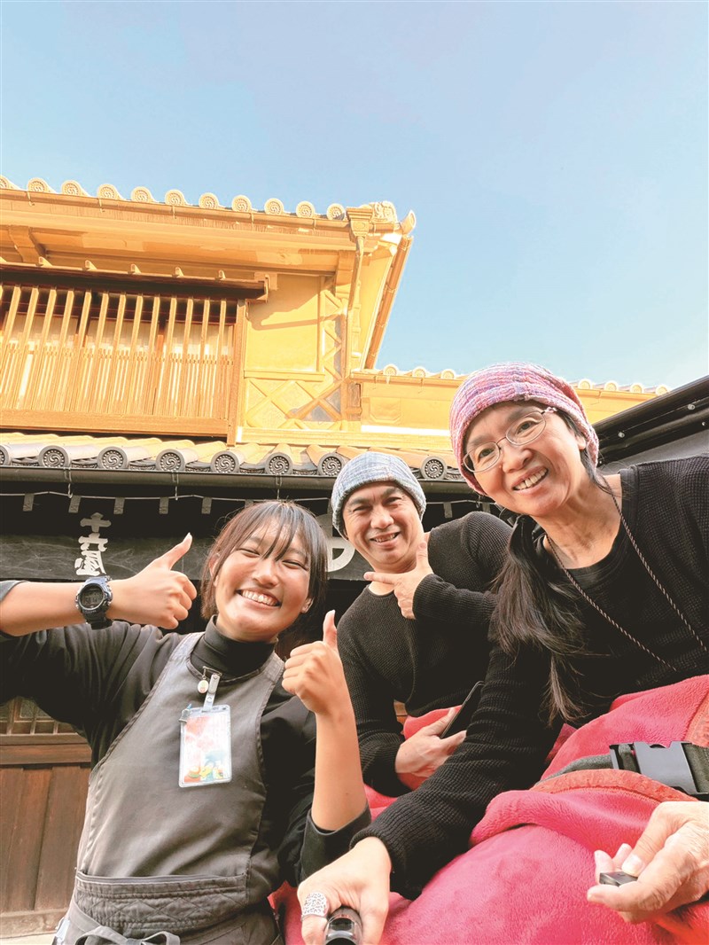 為我們拉車的女孩叫「淺井未悠」,她笑臉盈盈、皮膚黝黑,臉上被太陽晒出了小雀斑,她笑說:「這是太陽的禮物。」經過著名景點,她會停下來為我們解說歷史典故,還會幫忙拍照。過程中,我們透過翻譯機聊天,問她:「是利用假日出來打工嗎?」她回答:「這是我的正職。」我和志揚面面相覷,正職?表示她每天都在拉車,一天要跑好幾趟,難怪身形結實、感覺十分有力。