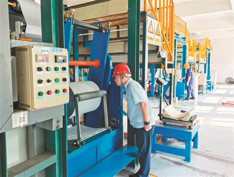 走進廣西賀州市桂東電子科技有限責任公司電極箔生產車間,公司副總經理梁力勃正在生產一線查看電極箔成品,不時調整生產參數。