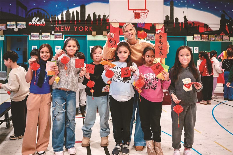 為推廣農曆新年文化與中華傳統藝術,佛光山紐約道場6日於紐約市法拉盛PS22公立小學舉辦「馬年新春活動」,15位佛光人在紐約道場監院有霖法師帶領下前往校園,透過書法、美勞與文化體驗,引領約340名學生在校園中感受年節喜氣,深化多元文化理解。圖為PS22公立小學師生展現自己寫的書法與小燈籠。 圖/人間社記者王喬榮