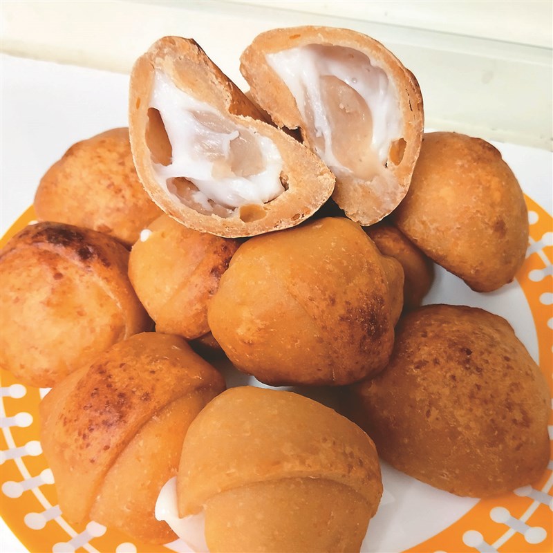 另取一大鋼盆,加入5g乾酵母以少許溫水融化後,拌入400g高筋麵粉、100g糯米粉、100g地瓜泥,視黏手程度慢慢加入100ml冷水,以順時針方向反覆折疊壓揉成有彈性不沾盆、手的光滑麵糰,置於盆中覆蓋靜置發酵約一小時後,稍滾圓整型排出空氣,分切成十份三角形狀,以擀麵棍壓平延展麵皮,從底端捲覆芋頭麻糬後,兩端捏合收口成橢圓狀,置放溫暖溼潤處發酵約一小時,以手指輕戳表面可以快速彈回後,置於烤箱200度烤約十五分鐘,或烤至八分鐘時,上色後降溫成180度,轉盤再烤約八分鐘即可出爐。