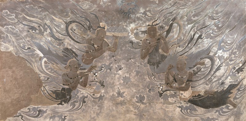 四身伎樂飛天兩兩相對,分別演奏琴、笛、阮咸和笙。飛天頭戴花冠,面形圓潤,五官清晰。形象端莊,飛動自然,從天而降。