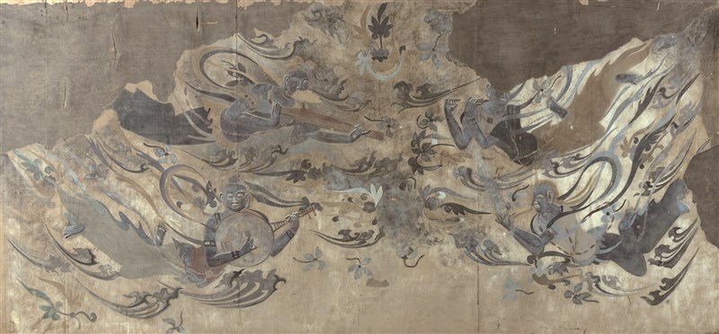 麥積山第四窟,七佛龕上方各有一幅北周原作飛天壁畫。其臉部、肢體等裸露處以淺浮雕技法塑出,衣飾飄帶則施以彩繪。此獨創技法名為「薄肉塑」,全國僅此一處,雕塑與繪畫在此渾然一體,飛天呼之欲出,衣帶當風,堪稱「古代壁畫藝術的絕品」。