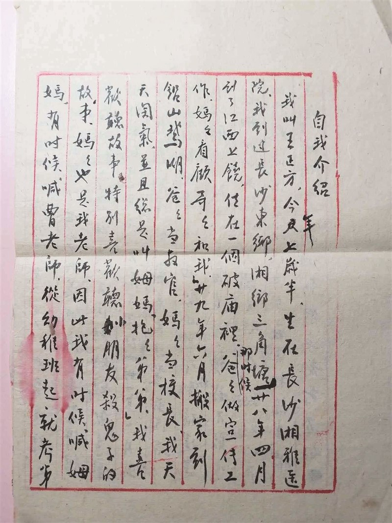 整理舊文件,在支離破碎、顏色泛黃的十行信紙堆中,赫然發現早年父親的手稿,其中有:〈我們怎樣協助掃除文盲王正方講〉、〈怎樣做一個現代的小學生〉、〈我愛我的國家〉、〈自我介紹〉。手稿上沒有日期,除了掃除文盲那篇演講稿註明我是講者,其他的可能是哥哥的演說稿,但〈自我介紹〉那一篇,可以確認是爸爸替我寫的。原文如下: