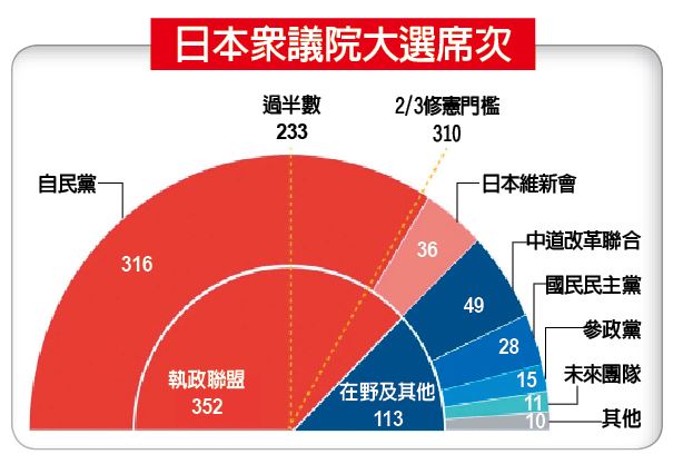 自民黨狂掃316席 川普賀高市 |2026.02.10 語音朗讀 22觀看次 字級 大 中 小 川普(右)8日發文祝賀高市在選舉中大獲全勝。圖為2人去年10月於日本橫須賀美軍基地會面。圖/美聯社日本眾議院大選席次 資料來源/NHK 圖/人間福報編輯部日本首相高市早苗(左1)在以壓倒性票數贏得選舉後,9日在東京自民黨總部召開記者會表示,將全力回應國民期待。圖/法新社 【本報綜合外電報導】日本首相高市早苗帶領自民黨在8日眾院選舉拿下歷史性大勝,單獨拿下眾院絕對多數。美國總統川普盛讚高市大獲成功,高市回應將在3月訪美會川普推進日美同盟,並表明將發展穩定的日中關係,還希望推動修憲。日本眾院選舉465席全數確定,高市帶領自民黨單獨拿下316席,是二戰後日本政黨首度跨越眾院3分之2絕對多數門檻,也寫下戰後單一政黨最多席次紀錄,是自民黨史上最佳選舉戰果,顯示執政黨在減稅、擴大軍事支出與修憲等關鍵議程上握有更大推進空間。對此,美國總統川普也送上祝賀,盛讚高市果斷改選大獲成功,並親切稱「能為早苗背書是我的榮幸」,表示永遠力挺日本。《紐約時報》分析指出,選舉結果顯示日本選民普遍支持高市在經濟、移民政策以及對華關係的強硬立場。日本自民黨在眾議院議員選舉大勝,在289個單一選區贏得249個,相當於整體的86%,包跨東京、埼玉、神奈川、靜岡、熊本、沖繩在內的31個地區,清一色由自民黨候選人勝出。由立憲民主黨與公明黨結成的「中道改革聯合」慘敗,從選前172席重挫到49席。共同代表野田佳彥、齊藤鐵夫已經決定引咎辭職。中道計畫本月13日選出新代表(黨主席)日本資深媒體人田崎史郎認為,一切歸功於高市的個人魅力,她提出「強大而富足」的口號,契合選民內心對新型領導者的深層期待;政治學者砂原庸介指出,日本社會正轉向「天然保守化」,支持者覺得高市政府最為親近,願將票投給執政黨。高市3/19訪白宮 強化美日同盟 川普於美東時間8日傍晚發文道賀自民黨風光完勝,並稱讚高市「推動保守、以實力求和平的施政議程時大獲成功」,並且豪氣表示「日本人踴躍投票,這些優秀的人民將永遠得到我強而有力的支持」。美國財政部長貝森特8日為高市在大選中「大獲全勝」喝采,強調強大的日本讓美國在亞洲更具實力。高市9日在X回應:「衷心感謝川普總統暖心致意,期待今年春天拜訪白宮,並持續與美方合作,強化日美同盟。」高市預計3月19日赴白宮會晤川普,這是她就任首相後首度訪美;隨後川普將在4月出訪中國。此外,南韓總統李在明9日透過社群網站發文,恭賀日本首相高市早苗率領自民黨在眾議院大選中的勝利,期盼盡快再於南韓會面;新加坡與日本今年迎來建交60周年,新加坡總理黃循財9日也發文祝賀高市早苗,並表示大選結果充分反映日本民眾對高市早苗的高度信任,期待深化星日合作。中日關係緊張 短期內恐難改善這場大勝被視為選民對高市路線的明確背書,包括對中國大陸更強硬的安全立場,也意味國內反對勢力難再構成實質阻礙;未來真正的制約,將更多來自對美依賴與對中壓力,而緊盯東京的北京顯然不樂見現況,中日關係短期恐難改善。大陸外交部發言人林劍9日重申,「再次敦促日方撤回高市涉台錯誤言論」,以實際行動展現維護中日關係政治基礎的基本誠意。針對高市稱正在營造環境參拜靖國神社,林劍說,否認罪責就意味著重犯,要求日方「謹言慎行,不要重蹈覆轍」。副總統蕭美琴昨表示,非常期待能跟高市領導的日本,尋求更多台日合作機會。蕭美琴說,區域的和平穩定是各方、各利益相關者的共同責任,也是全球對這個區域的期待。我國外交部期盼在台日關係既有良好基礎上,秉持「總合外交」理念與日本政府及朝野政黨持續深化實質合作,將雙邊關係提升為互補的「全面夥伴關係」,攜手共創印太地區的和平、穩定與繁榮。 前一篇文章 泰國大選 3 強鼎立 親台成共同亮點 下一篇文章 1月出口首破2兆元 史上第二大增幅 熱門新聞 01【遨遊藝事】巴黎 黛瑪兄弟茶館(Dammann Frères)2026.02.0602極樂寺彩繪燈籠 三好理念廣傳校園2026.02.0403兩岸新聞營師生 認識人間佛教2026.02.0504佛教藝文本土化 昆士蘭美術館團隊訪中天寺2026.02.050530冊佛教徒必讀經典 台北書展亮相2026.02.0406南韓城南高中、普中 棒球隊切磋球技2026.02.0407印尼佛教學院開學 培育國際弘法僧才2026.02.0508社區學童岡山講堂行春 學三好迎接午馬年2026.02.0509向前有路 光明在望2026.02.0510立春養生疏肝理氣 飲食調養少酸多甘2026.02.04 訂閱電子報 台北市 天氣預報 台灣一週天氣預報 相關報導 泰國大選 3 強鼎立 親台成共同亮點日眾院選舉 高市早苗大勝日本今大選 民調估自民黨眾院單獨過半冬奧開幕 首創4地連線進場 WBC中華隊 旅外戰力強悍 台積熊本二廠升級3奈米 魏哲家拜會高市