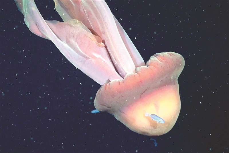 【本報綜合外電報導】科學家近日在阿根廷外海捕捉到巨大幻影水母(Giant Phantom Jelly)的畫面,不僅刷新科學界對深海巨型生物的認識,也首度在當地水域記錄到與魚類共生互動,引發關注。