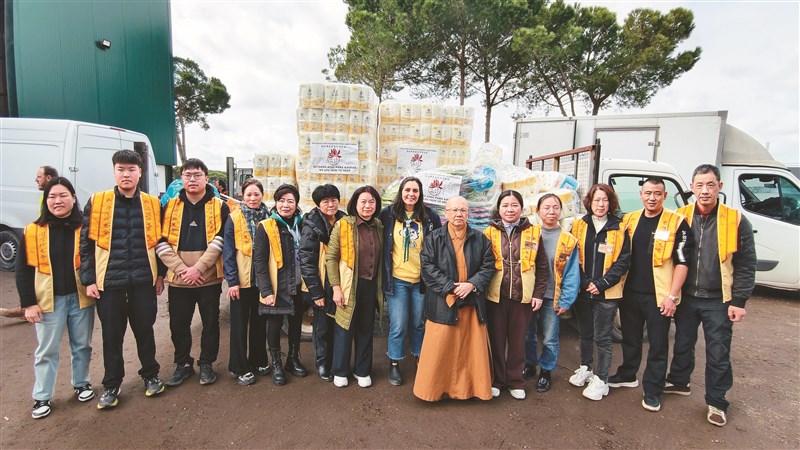 2月8日如海法師(右6)帶領佛光救援團隊,載運12個棧板救災物資,前往葡萄牙塞圖巴爾省重災區「阿爾卡塞爾杜薩爾」進行急難援助。 圖/人間社記者金毅
