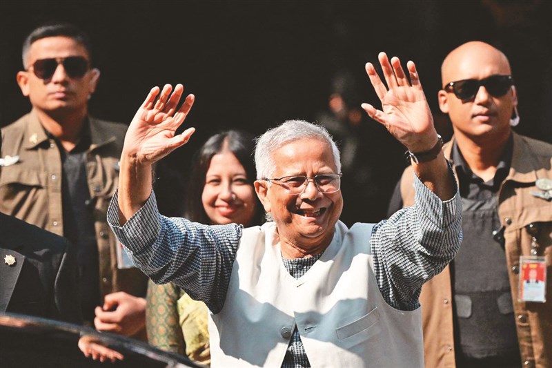 孟加拉12日舉行國會大選,臨時政府領導人尤努斯至投票所投票。圖/法新社