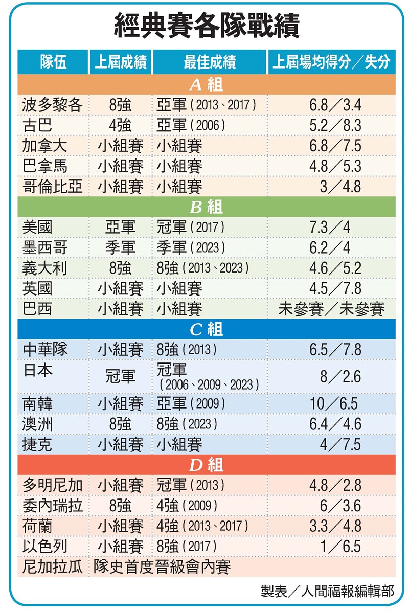 世界棒球經典賽 各隊備戰3月5日開打 文/記者張哲郢專題報導 |2026.02.13 語音朗讀 74觀看次 字級 大 中 小 經典賽各隊戰績 製表/人間福報編輯部2023世界棒球經典賽中華隊與荷蘭之戰,中華隊陳傑憲(左)4局下敲出帶有一分打點的三壘安打。圖/資料照片美國陣容,包含兩名賽揚獎投手史庫柏、史肯尼斯(圖)。圖/美聯社衛冕軍日本,在投打分別有山本由伸、大谷翔平領軍(圖)。 圖/ 美聯社美國陣容,包含兩名賽揚獎投手史庫柏(圖)、史肯尼斯。圖/美聯社衛冕軍日本,在投打分別有山本由伸(圖)、大谷翔平領軍。 圖/ 美聯社波多黎各隊有救援好手迪亞茲。圖/美聯社 文/記者張哲郢專題報導世界棒球經典賽開幕倒數不到20天,隨著各隊名單公布,即將進入最後衝刺階段,本周運動曼陀羅將彙整參賽20支隊伍整體戰力分析,讓球迷快速掌握各隊看點。首先是中華隊所在的C組,對手包含澳洲、捷克、南韓以及地主日本。論實力,衛冕軍日本可說是無人能出其右,在投打分別有山本由伸、大谷翔平領軍,加上過去經典賽屆屆保底4強,今年依舊被看好可以在分組出線。僅有2個晉級名額,日本很可能已經鎖定一個,剩下1張飛往邁阿密的晉級門票,才是C組的真正戰況;以實力來說,捷克相對其他球隊遜色,沒有任何現役大聯盟或小聯盟球員,在經典賽他們的角色比起競爭,更像是帶給人們驚奇跟希望。C組很可能成為台韓澳3搶1局面,澳洲上屆爆冷擊敗南韓,完成隊史首次突破小組賽壯舉,而南韓連3屆無緣小組賽出線,這次決心破釜沉舟,陣容跟世界12強棒球賽大不同,攻擊破壞力更強。中華隊同樣火力升級,首度有混血球員加入,旅外戰力成為這次經典賽中華隊重要輸出。不過C組並非賽會最難預測的組別,由波多黎各、加拿大、古巴、巴拿馬以及加拿大組成的A組,頗有上屆中華隊在A組既視感。上屆中華隊在小組賽取得2勝2敗,其他隊伍同樣都是2勝2敗,導致中華隊因較差的失分率墊底;回頭看這次A組,本該是最被看好的波多黎各,由於球員保險問題,包含林多(Francisco Lindor)、柯瑞亞(Carlos Correa)以及巴耶茲(Javier Baez)等大聯盟名將婉拒參加,實力跟上屆比大打折。美國隊 15大聯盟球星坐鎮在沒有特別強以及特別弱的隊伍下,美國媒體分析的戰力排名,A組隊伍都落在6到14名這區間,是相對難預測晉級隊伍的組別。至於B、D組,都跟C組類似,有 一支球隊格外強大。B組美國論陣容,現任15位大聯盟明星坐鎮,包含美國聯盟MVP得主賈吉(Aaron Judge)以及2名賽揚獎史庫柏(Tarik Skubal)、史肯尼斯(Paul Skenes),陣容堪稱這屆最鑽石。D組多明尼加也幾乎快集滿全大聯盟連線,且8名現役大聯盟明星是僅次於美國,打線一字排開更絲毫不亞於美國;同組的委內瑞拉陣容同樣豪華,在D組呈現明顯雙強勢力。球是圓的,賽前戰力評估終究只是設想,就像2024年,也沒人能想到中華隊能稱霸世界12強棒球賽,等3月5日到17日經典賽到來,勝負沒有一定,但肯定的是,又能再次掀起棒球熱。C組中華隊晉級 最大勁敵南韓■先看中華隊在世界棒球經典賽所在的C組,最被看好以及最被看衰的日本和捷克,兩者實力差異甚大,台澳韓3隊都有機會搶下第2張晉級門票,但普遍來說,真正關鍵是3月8日台韓戰。日本這次陣容高達9人是大聯盟層級,是C組之最,而日本職棒水準高,特別是投手群在日職成績都頗為亮眼,沒意外成為最被看好的隊伍之一。中華隊首戰交手澳洲,澳洲雖有5名球員有大聯盟經驗,但投手群整體年紀偏長,在澳職成績並不出色,會是這次袋鼠軍團罩門之一。至於最大敵人南韓,這次雖有不少球員因傷辭退,但南韓也找來4名混血戰力加入,投打各有1名已經在大聯盟繳出時機的歐布萊恩(Riley O'Brien)和瓊斯(Jahmai Jones);還有如金慧成、李政厚等大聯盟好手加入。中華隊則是旅外球員約一半,特別是投手群旅外人數過半,且不少人都在25歲以下,在具有競爭力的同時,也有未來性,古林睿煬和徐若熙預計是球隊雙王牌,後援以林凱威、曾峻岳雙保險搭配老江湖的陳冠宇,投手群角色明確。打者方面,2名混血龍恩(Jonathon Long)以及費爾柴德(Stuart Fairchild)分別有長打跟腳程,龍恩和張育成、李灝宇組成的長打部隊火力值得期待,隊長陳傑憲、鄭宗哲和吳念庭等人,球棒控制能力也很出色,整體是具有擊球率、速度以及一定火力的打線。A組波多黎各戰力打折 賽況多變■說起這次賽會死亡之組,A組隨著波多黎各戰力折損後,出線更多變數,加上各隊實力相當,成為這次賽會最多變數的小組。波多黎各因保險問題導致多名主力無法參賽,雖仍有救援好手迪亞茲(Edwin Diaz)、防守高手亞瑞納多(Nolan Arenado),但跟過去的戰力比起來,今年略為下滑,甚至不在戰力評比前5名內。這給予A組其他隊伍有機會爭取分組第1,最有機會的當屬加拿大,這支從未晉級8強的隊伍,可說是實力被低估,楓葉軍團有半數球員是大聯盟好手,以往常常跟中南美洲列強或美墨強權分在同組,這次加拿大在波多黎各相對較弱情形下,有機會寫下隊史紀錄。上屆重返4強的傳統強隊古巴,邀請球員不順利,大聯盟僅羅德里奎茲(Yariel Rodriguez)、孟卡達(Yoan Moncada)投打各1人,但投球端有日職兩大外籍強投莫伊尼洛(Livan Moinelo)、馬丁尼茲(Raidel Martinez),搭配一票老將,可說是小組賽最具國際大賽經驗的隊伍。至於哥倫比亞和巴拿馬2支中美洲球隊,在小組實力偏後段,但差距不大,兩邊都有大聯盟名將如昆塔納(Jose Qiuntana)、赫雷拉